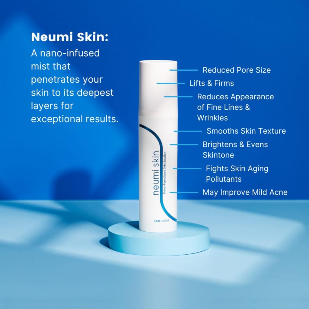 NUMISKIN este un ser facial de ultimă generație, creat cu tehnologia patentată Neumi Nanotech™, în care nano-glutationul, colagenul, vitamina C, acidul hialuronic, curcumina și arginina sunt încapsulate în apă ultra-pură.